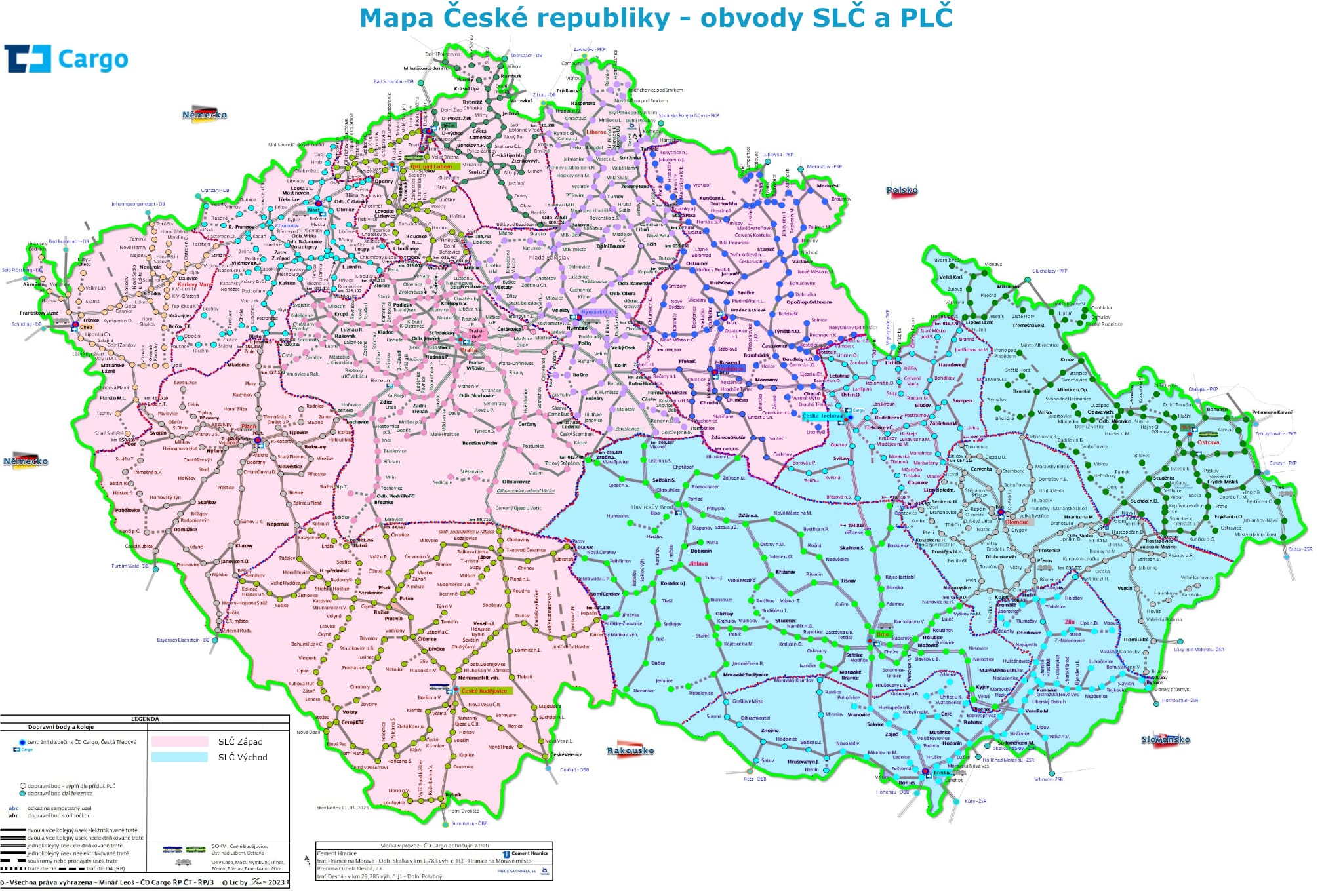 Se vznikem nové organizační jednotky - Řízení lokomotivních čet vzniknou i dvě Střediska lokomotivních čet (SLČ Východ a SLČ Západ - na přiložené mapě označeny modrou a růžovou barvou). Nepředpokládáme, že by zaměstnavatel chtěl předkládat pracovní smlouvy s tímto místem výkonu práce, ale kdyby náhodou (například u strojvedoucích flexi), znamenalo by to pro vás, že vám zaměstnavatel může nařídit nástup výkonu práce (tedy bez Rg jízdy) kdekoli v příslušné barevně vyznačené oblasti.